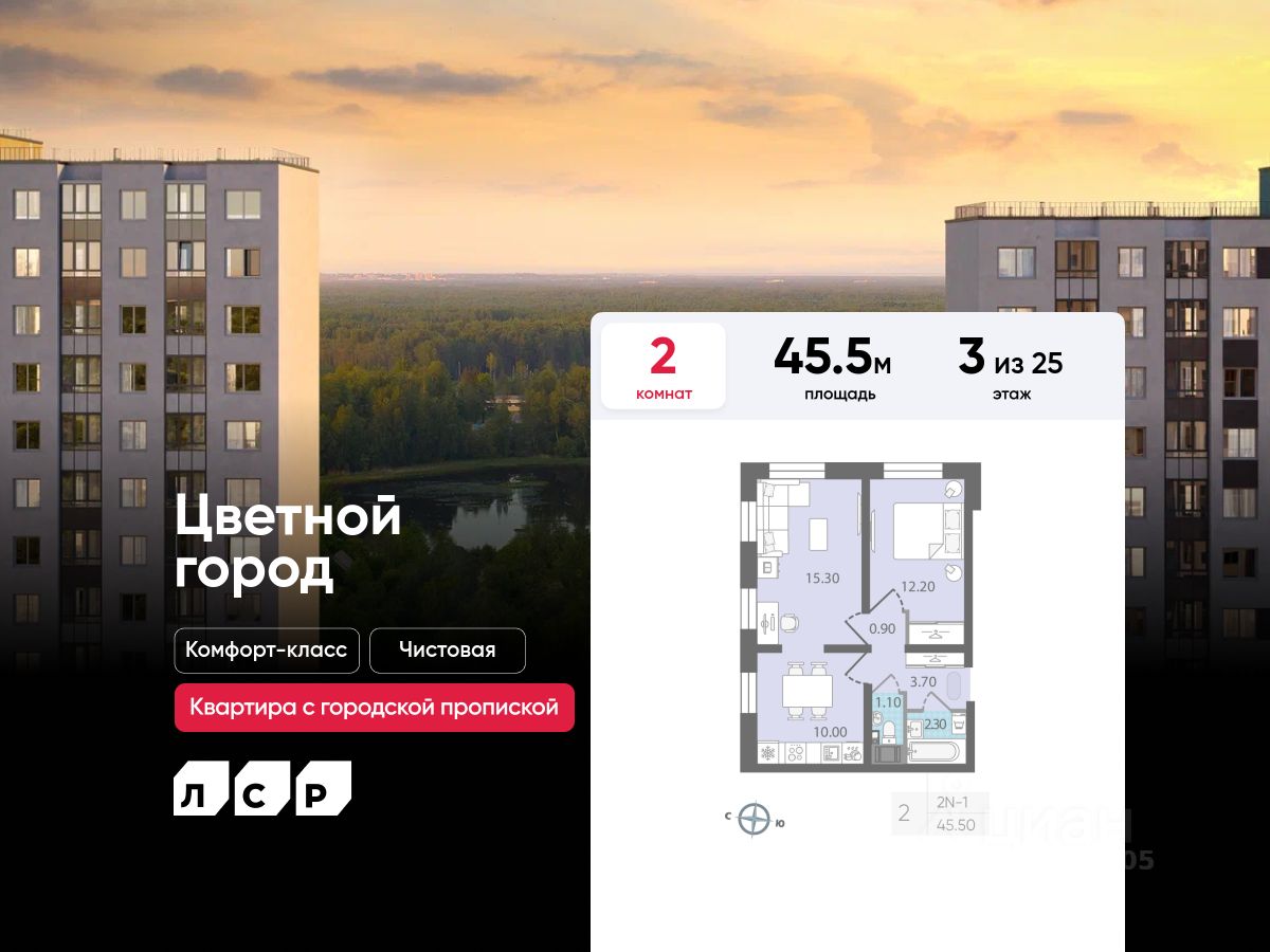 Продается 2-комнатная квартира в ЖК "Цветной город" на 3 этаже. Общая площадь составляет 45.50 кв. м. Квартира с чистовой отделкой Срок сдачи дома: 4 квартал 2025. Жилой комплекс "Цветной город" располагается по адресу Санкт-Петербург, Красногвардейский.