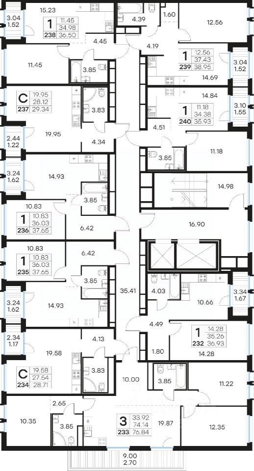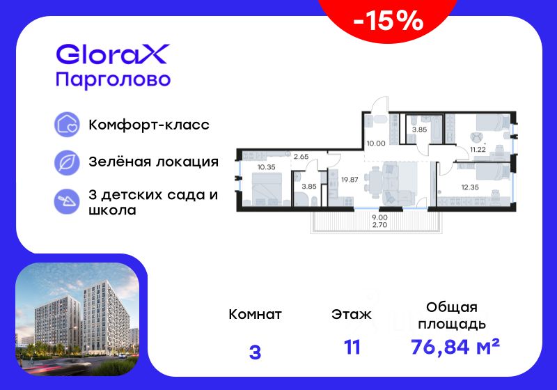 Продается 3-комн. квартира на 11-м этаже в проекте комфорт-класса GloraX Парголово. Общая площадь лота составляет 76,84 кв. м, из которых 33,92 кв. м отведено под жилую и 19,87 кв. м под кухонную зону. Номер квартиры - 233.