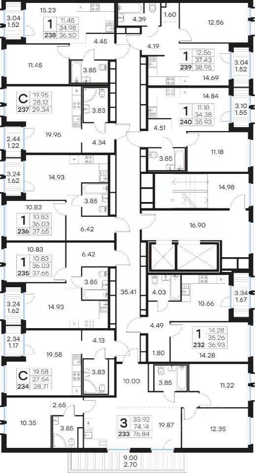 Продается 1-комн. квартира на 11-м этаже в проекте комфорт-класса GloraX Парголово. Общая площадь лота составляет 38,95 кв. м, из которых 12,56 кв. м отведено под жилую и 14,69 кв. м под кухонную зону. Номер квартиры - 239.