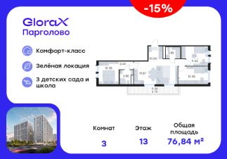 Продается 3-комн. квартира на 13-м этаже в проекте комфорт-класса GloraX Парголово. Общая площадь лота составляет 76,84 кв. м, из которых 33,92 кв. м отведено под жилую и 19,87 кв. м под кухонную зону. Номер квартиры - 251.