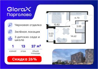 Продается 1-комн. квартира на 13-м этаже в проекте комфорт-класса GloraX Парголово. Общая площадь лота составляет 37,53 кв. м, из которых 10,82 кв. м отведено под жилую и 14,62 кв. м под кухонную зону. Номер квартиры - 115.