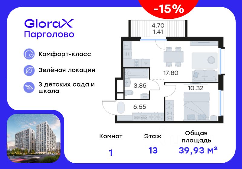 Продается 1-комн. квартира на 13-м этаже в проекте комфорт-класса GloraX Парголово. Общая площадь лота составляет 39,93 кв. м, из которых 10,32 кв. м отведено под жилую и 17,80 кв. м под кухонную зону. Номер квартиры - 119.
