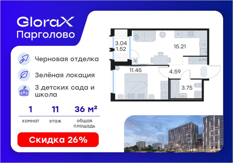 Продается 1-комн. квартира на 11-м этаже в проекте комфорт-класса GloraX Парголово. Общая площадь лота составляет 36,52 кв. м, из которых 11,45 кв. м отведено под жилую и 15,21 кв. м под кухонную зону. Номер квартиры - 238.