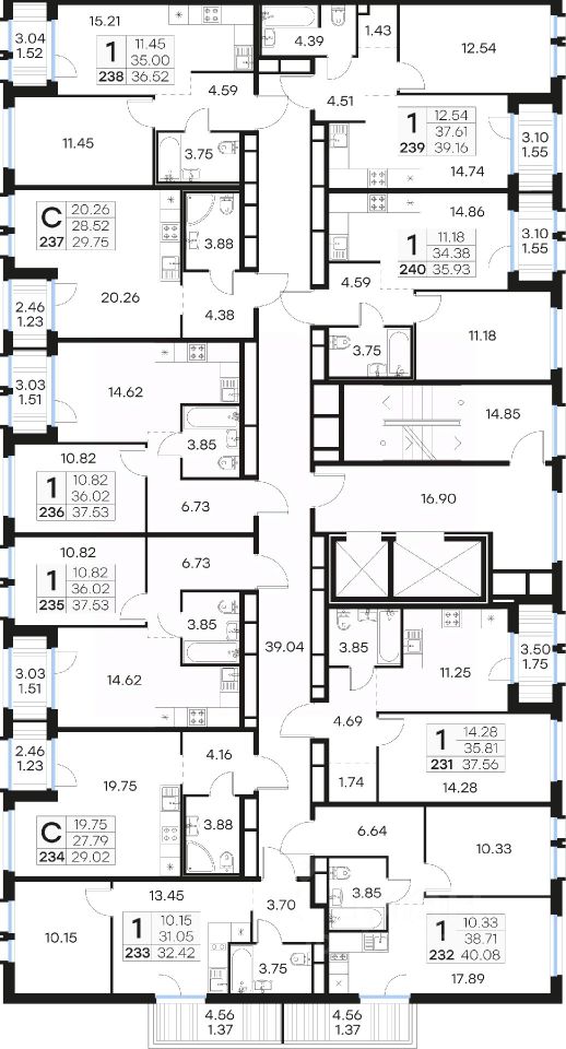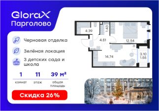 Продается 1-комн. квартира на 11-м этаже в проекте комфорт-класса GloraX Парголово. Общая площадь лота составляет 39,16 кв. м, из которых 12,54 кв. м отведено под жилую и 14,74 кв. м под кухонную зону. Номер квартиры - 239.