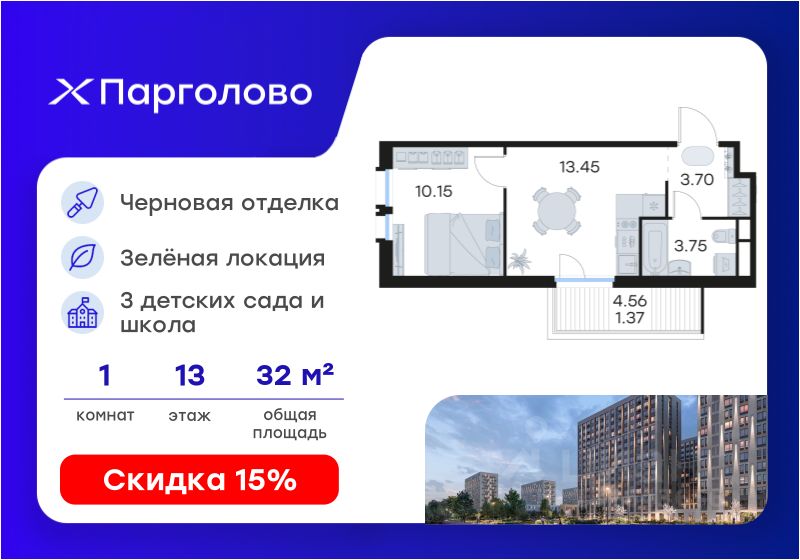 Продается 1-комн. квартира на 13-м этаже в проекте комфорт-класса Парголово. Общая площадь лота составляет 32,42 кв. м, из которых 10,15 кв. м отведено под жилую и 13,45 кв. м под кухонную зону. Номер квартиры - 253.