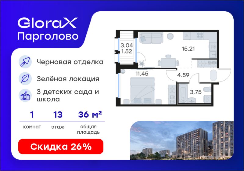 Продается 1-комн. квартира на 13-м этаже в проекте комфорт-класса GloraX Парголово. Общая площадь лота составляет 36,52 кв. м, из которых 11,45 кв. м отведено под жилую и 15,21 кв. м под кухонную зону. Номер квартиры - 258.