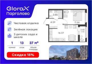 Продается 1-комн. квартира на 13-м этаже в проекте комфорт-класса GloraX Парголово. Общая площадь лота составляет 37,87 кв. м, из которых 11,66 кв. м отведено под жилую и 16,07 кв. м под кухонную зону. Номер квартиры - 160.