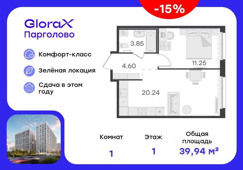 Продается 1-комн. квартира на 1-м этаже в проекте комфорт-класса GloraX Парголово. Общая площадь лота составляет 39,94 кв. м, из которых 11,25 кв. м отведено под жилую и 20,24 кв. м под кухонную зону. Номер квартиры - 4.