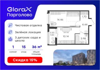 Продается 1-комн. квартира на 15-м этаже в проекте комфорт-класса GloraX Парголово. Общая площадь лота составляет 36,32 кв. м, из которых 14,46 кв. м отведено под жилую и 10,14 кв. м под кухонную зону. Номер квартиры - 180.