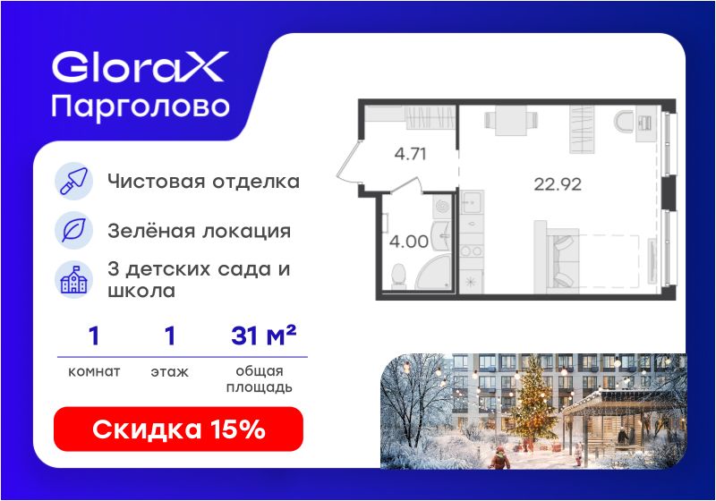 Продается квартира-студия на 1-м этаже в проекте комфорт-класса GloraX Парголово. Общая площадь лота составляет 31,63 кв. м, из которых 22,92 кв. м отведено под жилую и кв. м под кухонную зону. Номер квартиры - 5.