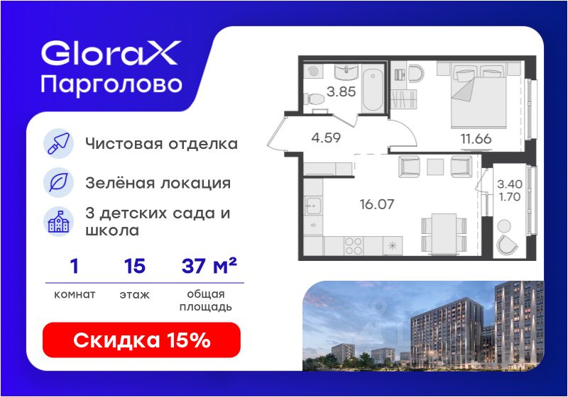 Продается 1-комн. квартира на 15-м этаже в проекте комфорт-класса GloraX Парголово. Общая площадь лота составляет 37,87 кв. м, из которых 11,66 кв. м отведено под жилую и 16,07 кв. м под кухонную зону. Номер квартиры - 186.
