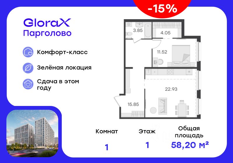 Продается 1-комн. квартира  на 1-м этаже в проекте комфорт-класса GloraX Парголово. Общая площадь лота составляет 58,20 кв. м, из которых 11,52 кв. м отведено под жилую и 22,93 кв. м под кухонную зону. Номер квартиры - 6.