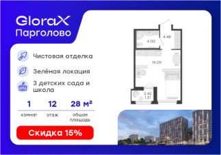 Продается квартира-студия на 12-м этаже в проекте комфорт-класса GloraX Парголово. Общая площадь лота составляет 28,78 кв. м, из которых 19,09 кв. м отведено под жилую и кв. м под кухонную зону. Номер квартиры - 256.