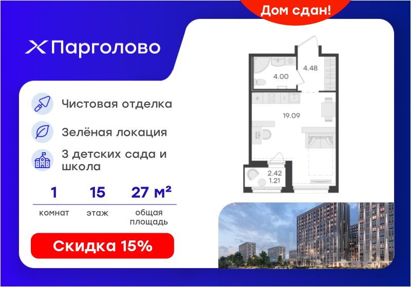 Продается квартира-студия на 15-м этаже в проекте комфорт-класса Парголово. Общая площадь лота составляет 28,78 кв. м, из которых 19,09 кв. м отведено под жилую и кв. м под кухонную зону. Номер квартиры - 274.