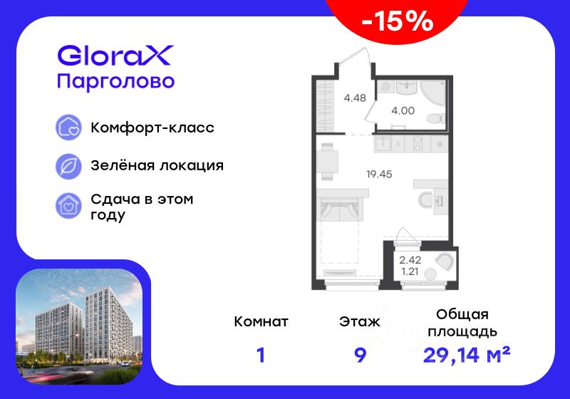 Продается квартира-студия на 9-м этаже в проекте комфорт-класса GloraX Парголово. Общая площадь лота составляет 29,14 кв. м, из которых 19,45 кв. м отведено под жилую и  кв. м под кухонную зону. Номер квартиры - 237.