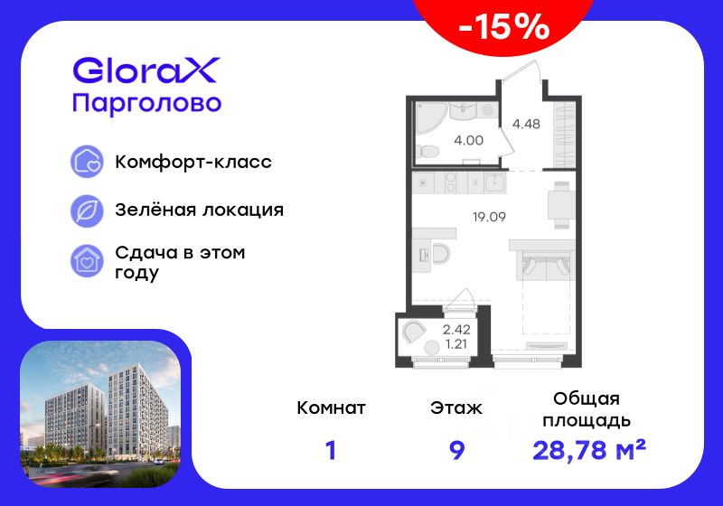 Продается квартира-студия на 9-м этаже в проекте комфорт-класса GloraX Парголово. Общая площадь лота составляет 28,78 кв. м, из которых 19,09 кв. м отведено под жилую и кв. м под кухонную зону. Номер квартиры - 238.