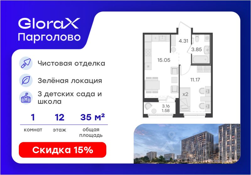 Продается 1-комн. квартира на 12-м этаже в проекте комфорт-класса GloraX Парголово. Общая площадь лота составляет 35,96 кв. м, из которых 11,17 кв. м отведено под жилую и 15,05 кв. м под кухонную зону. Номер квартиры - 339.