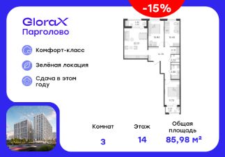Продается 3-комн. квартира на 14-м этаже в проекте комфорт-класса GloraX Парголово. Общая площадь лота составляет 85,98 кв. м, из которых 36,99 кв. м отведено под жилую и 22,51 кв. м под кухонную зону. Номер квартиры - 349.