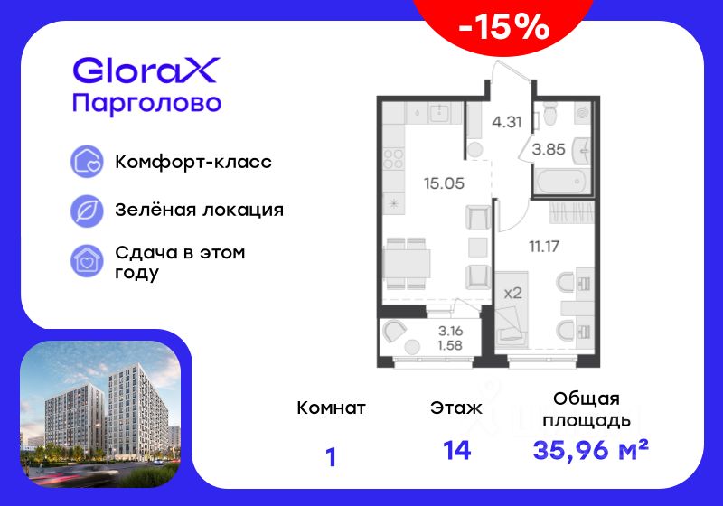 Продается 1-комн. квартира на 14-м этаже в проекте комфорт-класса GloraX Парголово. Общая площадь лота составляет 35,96 кв. м, из которых 11,17 кв. м отведено под жилую и 15,05 кв. м под кухонную зону. Номер квартиры - 351.