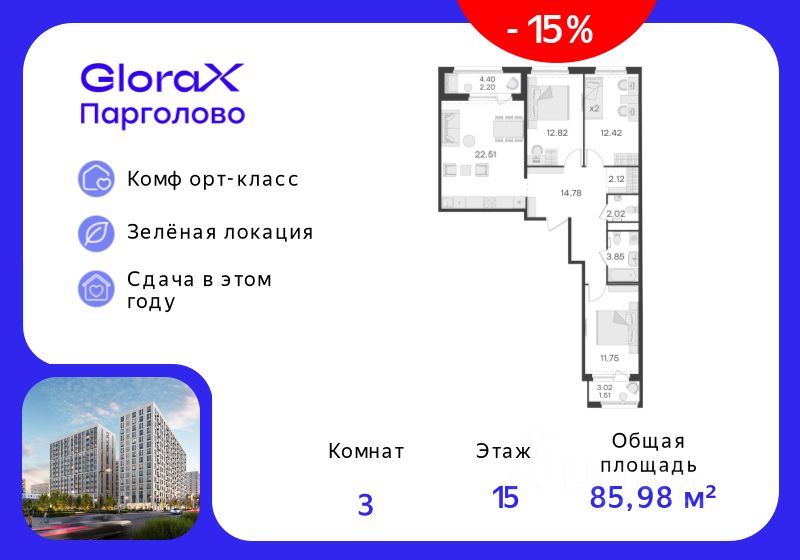 Продается 3-комн. квартира  на 15-м этаже в проекте комфорт-класса GloraX Парголово. Общая площадь лота составляет 85,98 кв. м, из которых 36,99 кв. м отведено под жилую и 22,51 кв. м под кухонную зону. Номер квартиры - 355.