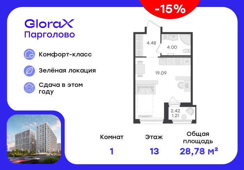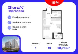 Продается квартира-студия на 13-м этаже в проекте комфорт-класса GloraX Парголово. Общая площадь лота составляет 28,78 кв. м, из которых 19,09 кв. м отведено под жилую и кв. м под кухонную зону. Номер квартиры - 429.