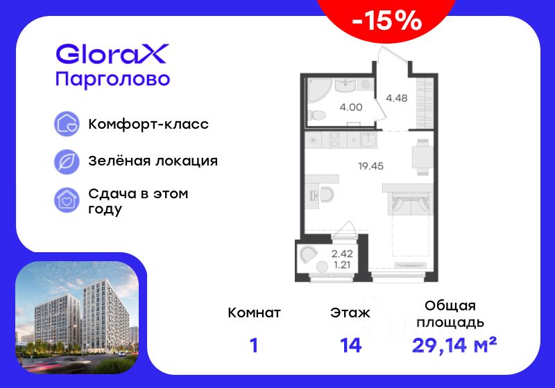 Продается квартира-студия на 14-м этаже в проекте комфорт-класса GloraX Парголово. Общая площадь лота составляет 29,14 кв. м, из которых 19,45 кв. м отведено под жилую и кв. м под кухонную зону. Номер квартиры - 436.