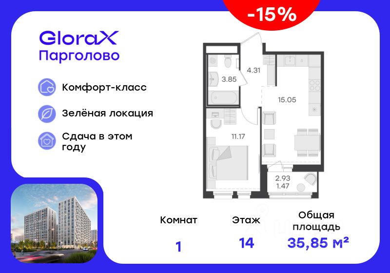 Продается 1-комн. квартира на 14-м этаже в проекте комфорт-класса GloraX Парголово. Общая площадь лота составляет 35,85 кв. м, из которых 11,17 кв. м отведено под жилую и 15,05 кв. м под кухонную зону. Номер квартиры - 437.