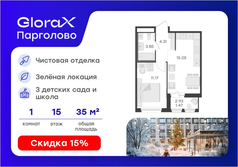 Продается 1-комн. квартира на 15-м этаже в проекте комфорт-класса GloraX Парголово. Общая площадь лота составляет 35,85 кв. м, из которых 11,17 кв. м отведено под жилую и 15,05 кв. м под кухонную зону. Номер квартиры - 443.