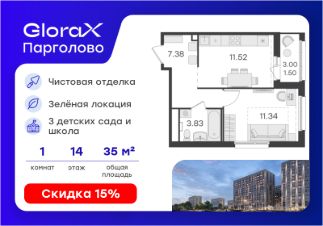 Продается 1-комн. квартира на 14-м этаже в проекте комфорт-класса GloraX Парголово. Общая площадь лота составляет 35,57 кв. м, из которых 11,34 кв. м отведено под жилую и 11,52 кв. м под кухонную зону. Номер квартиры - 603.