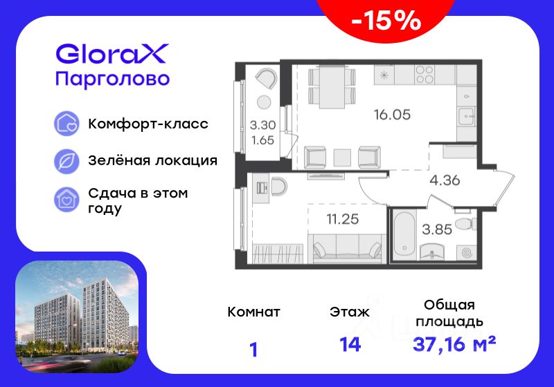 Продается 1-комн. квартира на 14-м этаже в проекте комфорт-класса GloraX Парголово. Общая площадь лота составляет 37,16 кв. м, из которых 11,25 кв. м отведено под жилую и 16,05 кв. м под кухонную зону. Номер квартиры - 606.