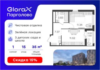 Продается 1-комн. квартира на 15-м этаже в проекте комфорт-класса GloraX Парголово. Общая площадь лота составляет 35,56 кв. м, из которых 11,34 кв. м отведено под жилую и 11,52 кв. м под кухонную зону. Номер квартиры - 624.