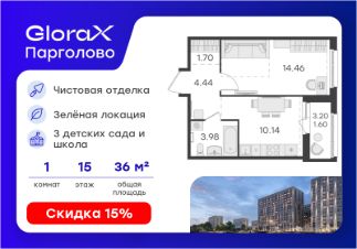 Продается 1-комн. квартира на 15-м этаже в проекте комфорт-класса GloraX Парголово. Общая площадь лота составляет 36,32 кв. м, из которых 14,46 кв. м отведено под жилую и 10,14 кв. м под кухонную зону. Номер квартиры - 626.