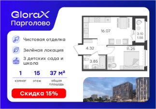 Продается 1-комн. квартира на 15-м этаже в проекте комфорт-класса GloraX Парголово. Общая площадь лота составляет 37,04 кв. м, из которых 11,25 кв. м отведено под жилую и 16,07 кв. м под кухонную зону. Номер квартиры - 614.