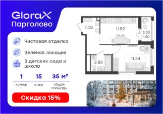 Продается 1-комн. квартира на 15-м этаже в проекте комфорт-класса GloraX Парголово. Общая площадь лота составляет 35,57 кв. м, из которых 11,34 кв. м отведено под жилую и 11,52 кв. м под кухонную зону. Номер квартиры - 616.