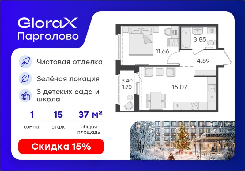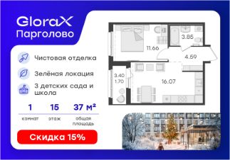Продается 1-комн. квартира на 15-м этаже в проекте комфорт-класса GloraX Парголово. Общая площадь лота составляет 37,87 кв. м, из которых 11,66 кв. м отведено под жилую и 16,07 кв. м под кухонную зону. Номер квартиры - 620.