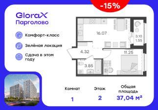 Продается 1-комн. квартира на 2-м этаже в проекте комфорт-класса GloraX Парголово. Общая площадь лота составляет 37,04 кв. м, из которых 11,25 кв. м отведено под жилую и 16,07 кв. м под кухонную зону. Номер квартиры - 445.