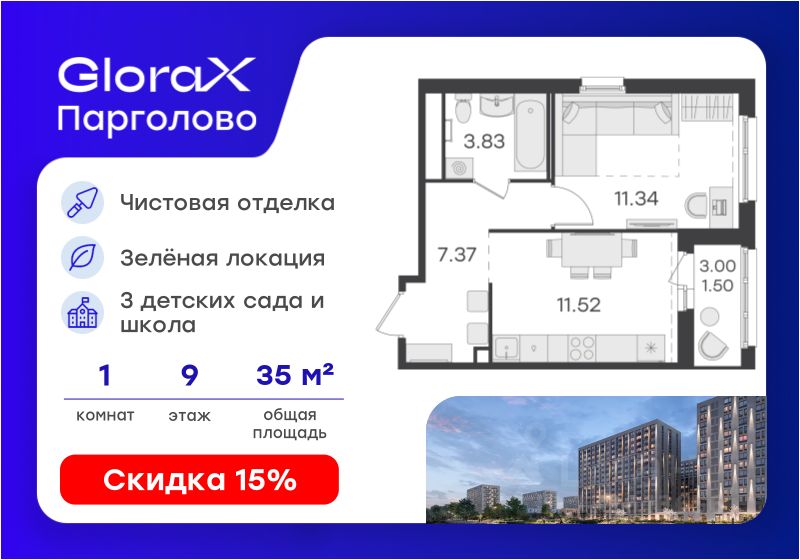 Продается 1-комн. квартира на 9-м этаже в проекте комфорт-класса GloraX Парголово. Общая площадь лота составляет 35,56 кв. м, из которых 11,34 кв. м отведено под жилую и 11,52 кв. м под кухонную зону. Номер квартиры - 546.