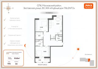 Квартира общей площадью 92м2, включает в себя просторную кухню-гостиную 42,91м2, две изолированные комнаты по 16м2 и два санузла.