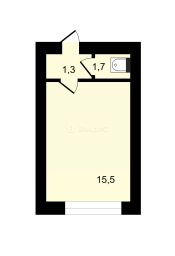 Общая площадь студии составляет 18,5 кв. м, жилая — 15 кв. м. Высота потолков 2,6 м создаёт ощущение простора. В квартире старый ремонт, что даёт возможность новым владельцам реализовать свои дизайнерские идеи.