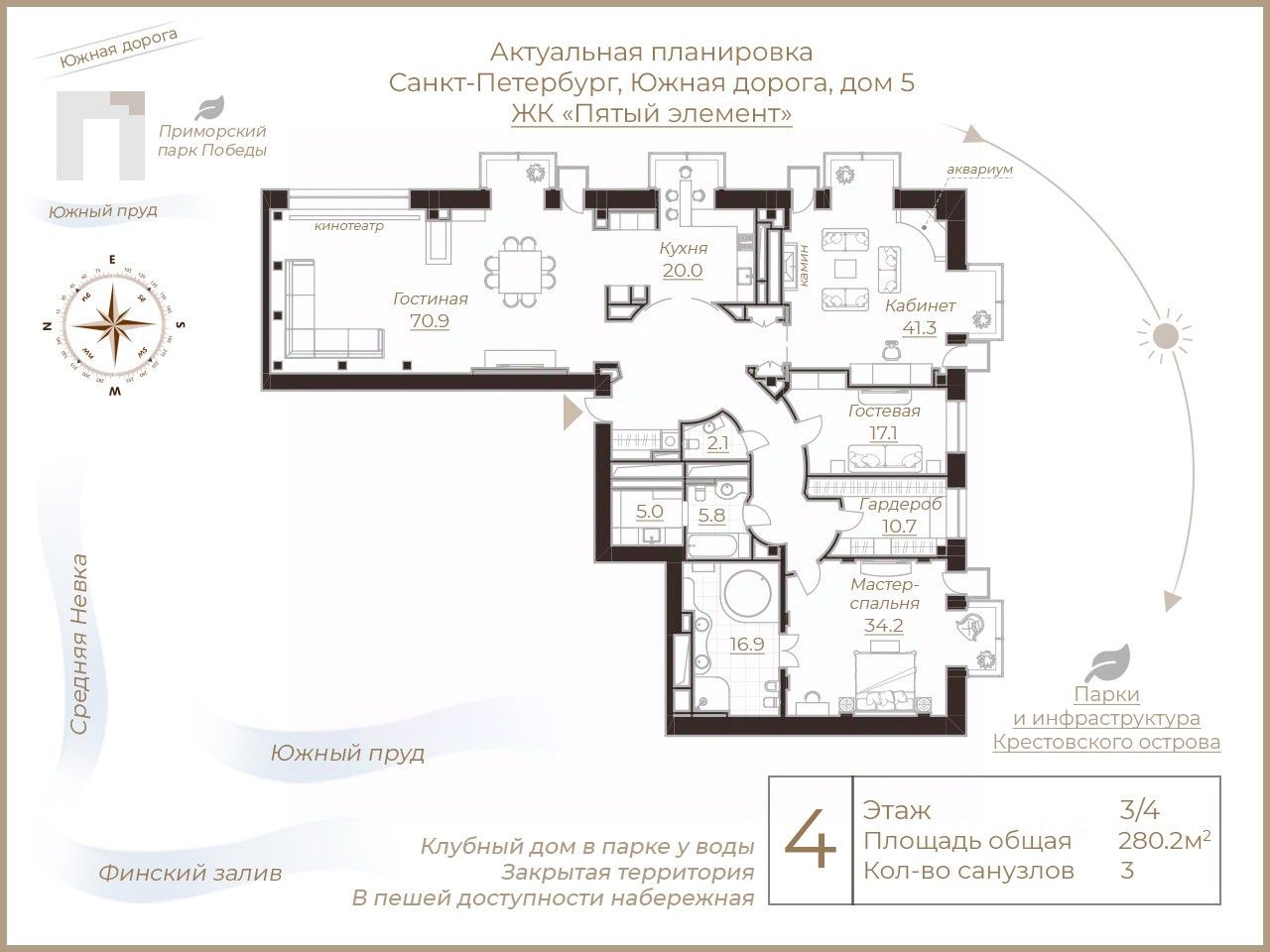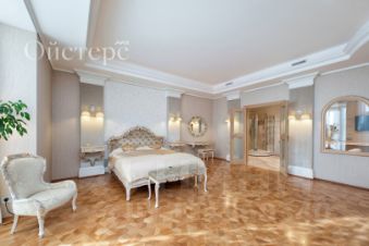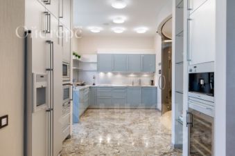 расположенном на Крестовском острове на территории Приморского парка Победы. Уникальная возможность жить в гармонии с природой! Дом окружен зеленью, главный фасад обращен на Южный пруд. Ухоженная закрытая территория с контролем доступа и видеонаблюдением, профессиональная охрана 24/7. В доме 38 квартир, автономная котельная, бесшумные лифты OTIS, спускающиеся в паркинг, места для хранения сезонной резины и велосипедов. Квартира находится на третьем этаже (одна на этаже). Просторные эркеры и панорамные окна на восточную и южную стороны наполняют квартиру светом и открывают великолепный вид на парк Крестовского острова. Открытые пространства и эргономичные дизайнерские решения в стиле современной классики, роскошные каменные полы, паркет и встроенная мебель из натурального дерева. Просторный холл с вместительным шкафом-купе и гостевым санузлом. Гостиная в светлых тонах. Итальянская мебель TURA, MINOTTI и тёплый янтарного цвета паркет в сочетании с подсвеченными изнутри колоннами из оникса и инсталляцией-водопадом создают уютную атмосферу. Зона домашнего кинотеатра с большим экраном оборудована аппаратурой LINN и