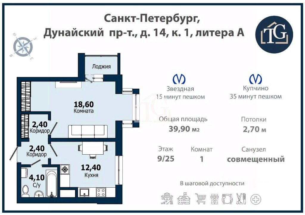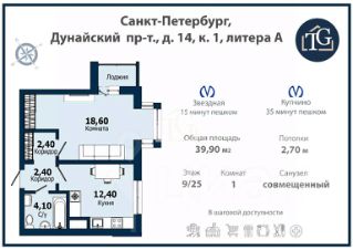 1-комнатная квартира 39,9 м² в ЖК "Viva", Московский район, у метро "Звёздная"