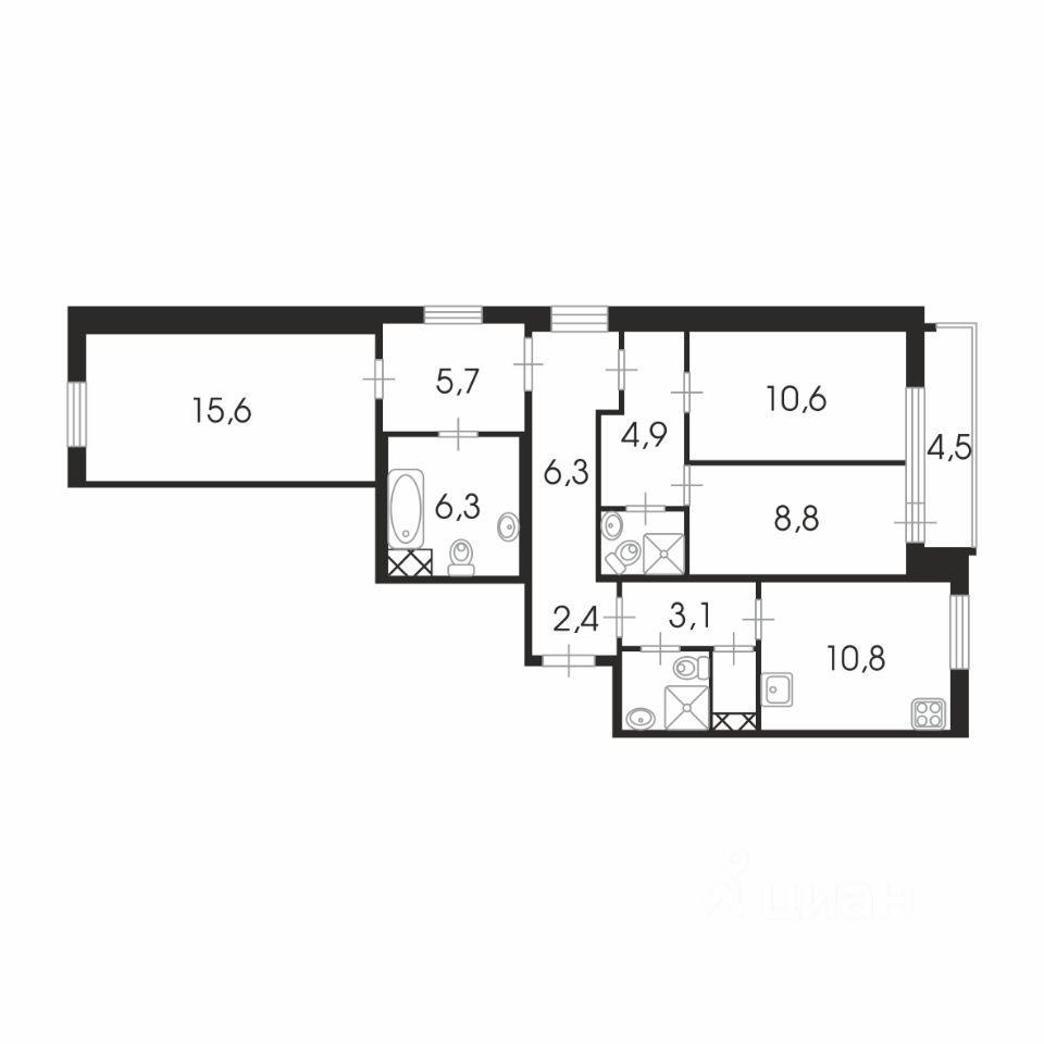 Свет и простор: Окна выходят на три стороны света — квартира наполнена солнцем весь день. Три большие комнаты (от 15.6; 19.7; 19.8 кв.м.) дают свободу для зонирования: можно легко создать мастер-спальню с гардеробной и санузлом или даже четвертую комнату.