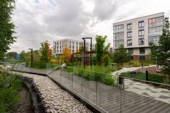 Курортная атмосфера поддерживается беседками для отдыха, детскими площадками в эко-стиле, променадом на набережной с островками для медитации.