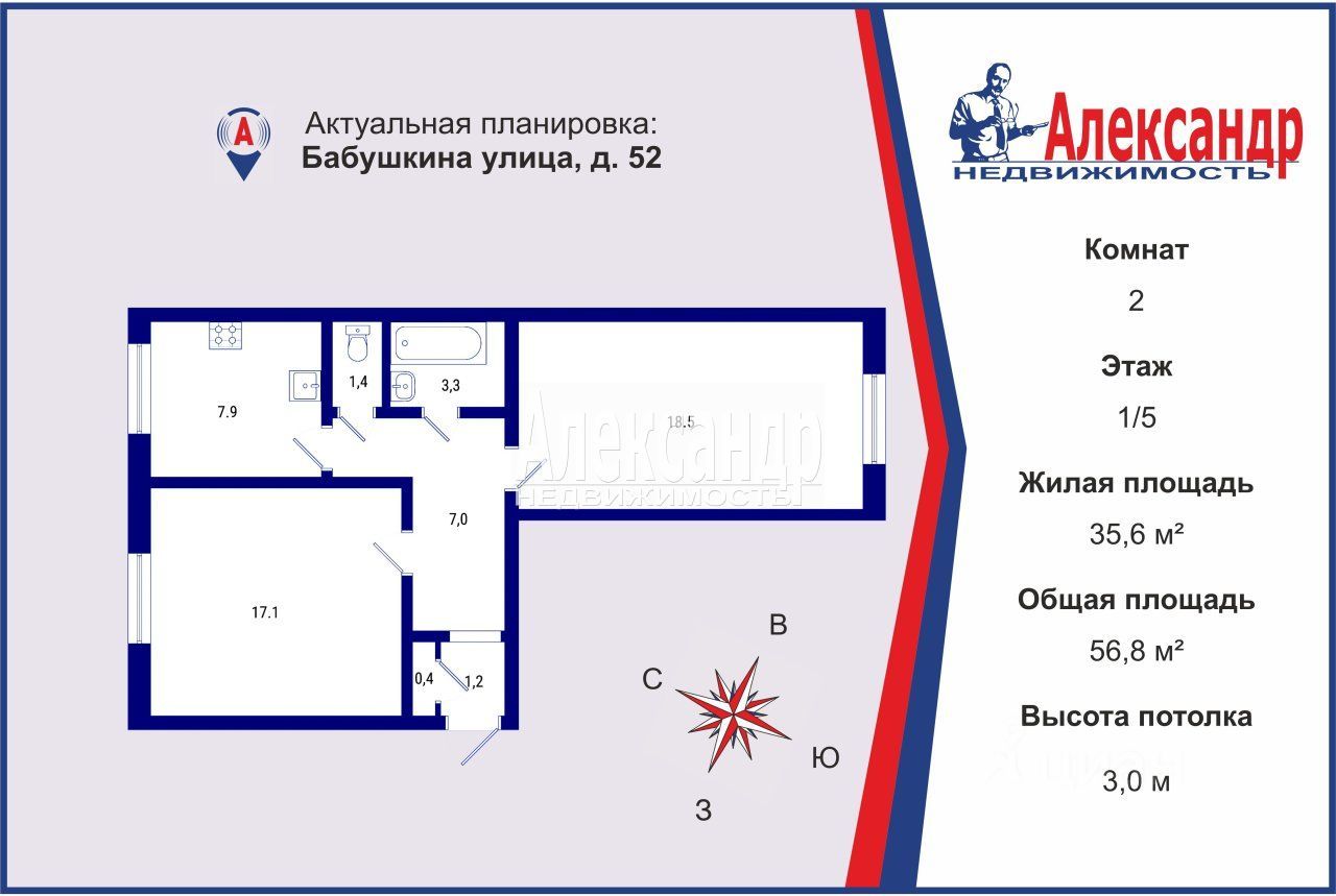 Общая площадь 56,8 м. Комнаты 18,5 м и 17,1 м. Кухня 8 м.