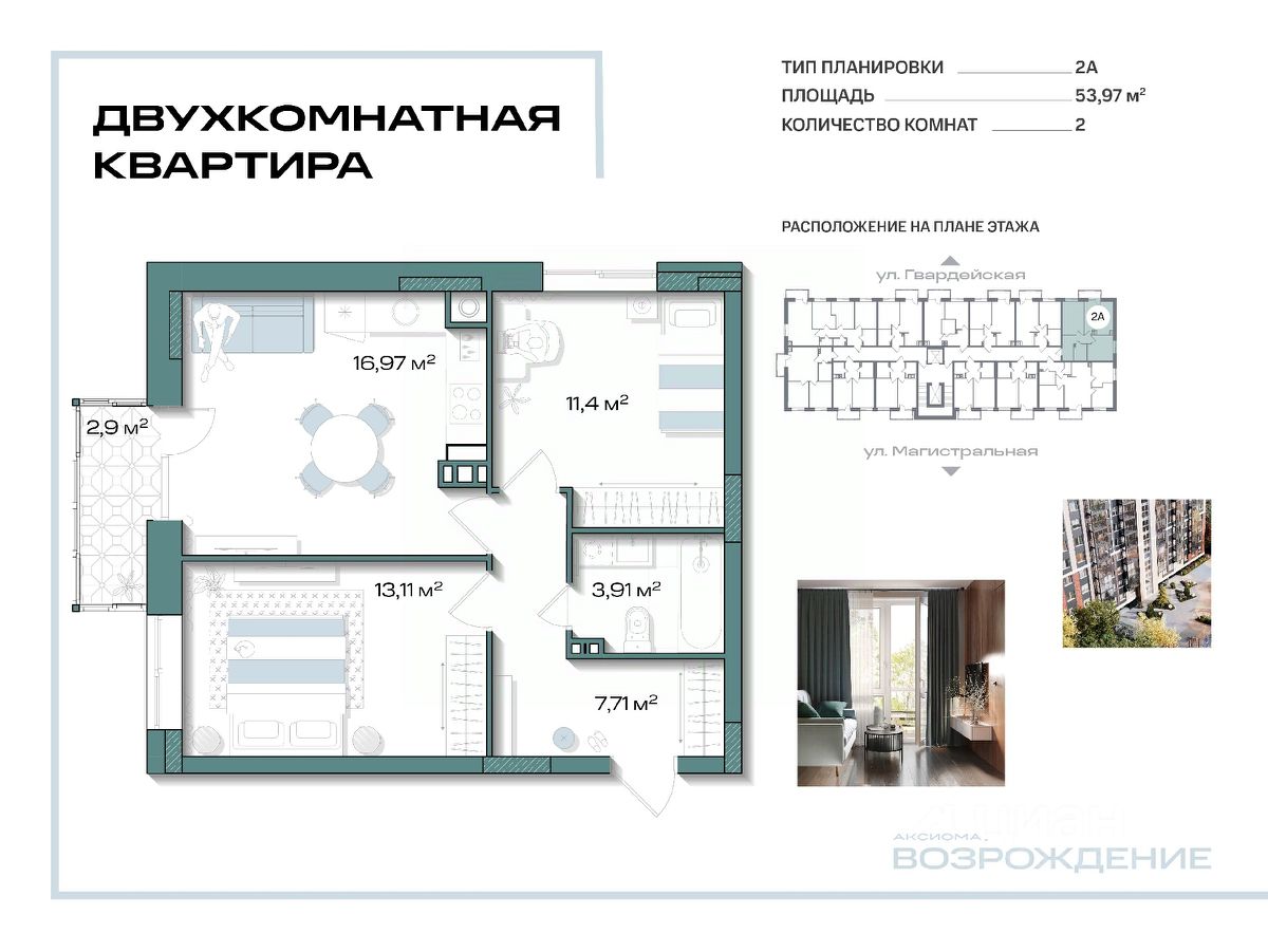Продаётся 2-комнатная квартира в строящемся доме (Дом 6), срок сдачи: I-кв. 2028, общей площадью 53.97 кв.м., на 5 этаже. Новый клубный дом "Аксиома.Возрождение" от застройщика "Аксиома" расположен по адресу: г. Кировск, ул. Красных Сосен, 6