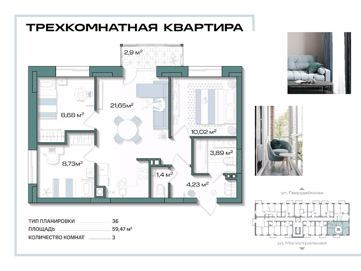 Продаётся 3-комнатная квартира в строящемся доме (Дом 6), срок сдачи: I-кв. 2028, общей площадью 59.47 кв.м., на 5 этаже. Новый клубный дом "Аксиома.Возрождение" от застройщика "Аксиома" расположен по адресу: г. Кировск, ул. Красных Сосен, 6