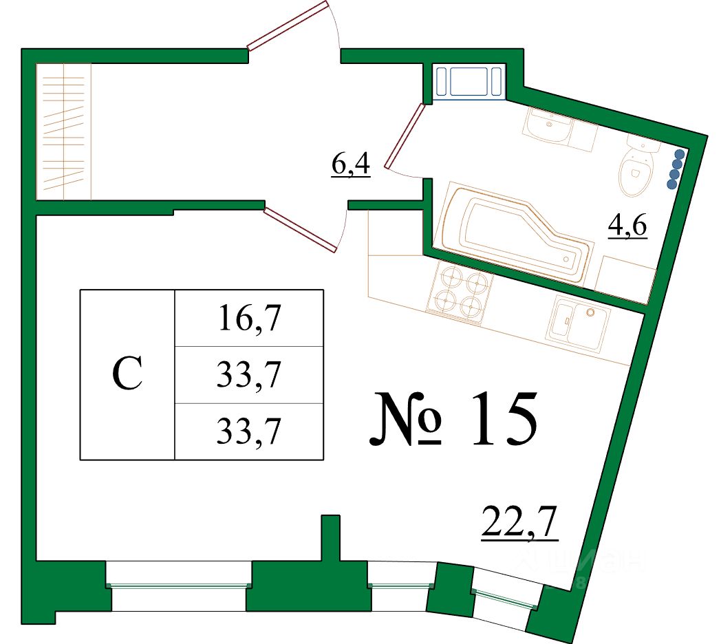Продаётся студия в сданном доме (Корпус 2), срок сдачи: IV-кв. 2024, общей площадью 33.7 кв.м., на 2 этаже.
