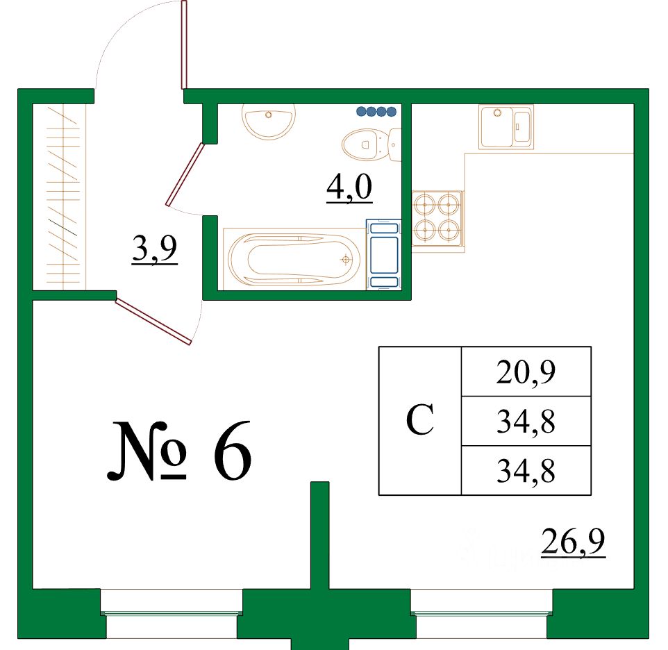 Продаётся студия в сданном доме (Корпус 5), срок сдачи: III-кв. 2025, общей площадью 34.8 кв.м., на 1 этаже.