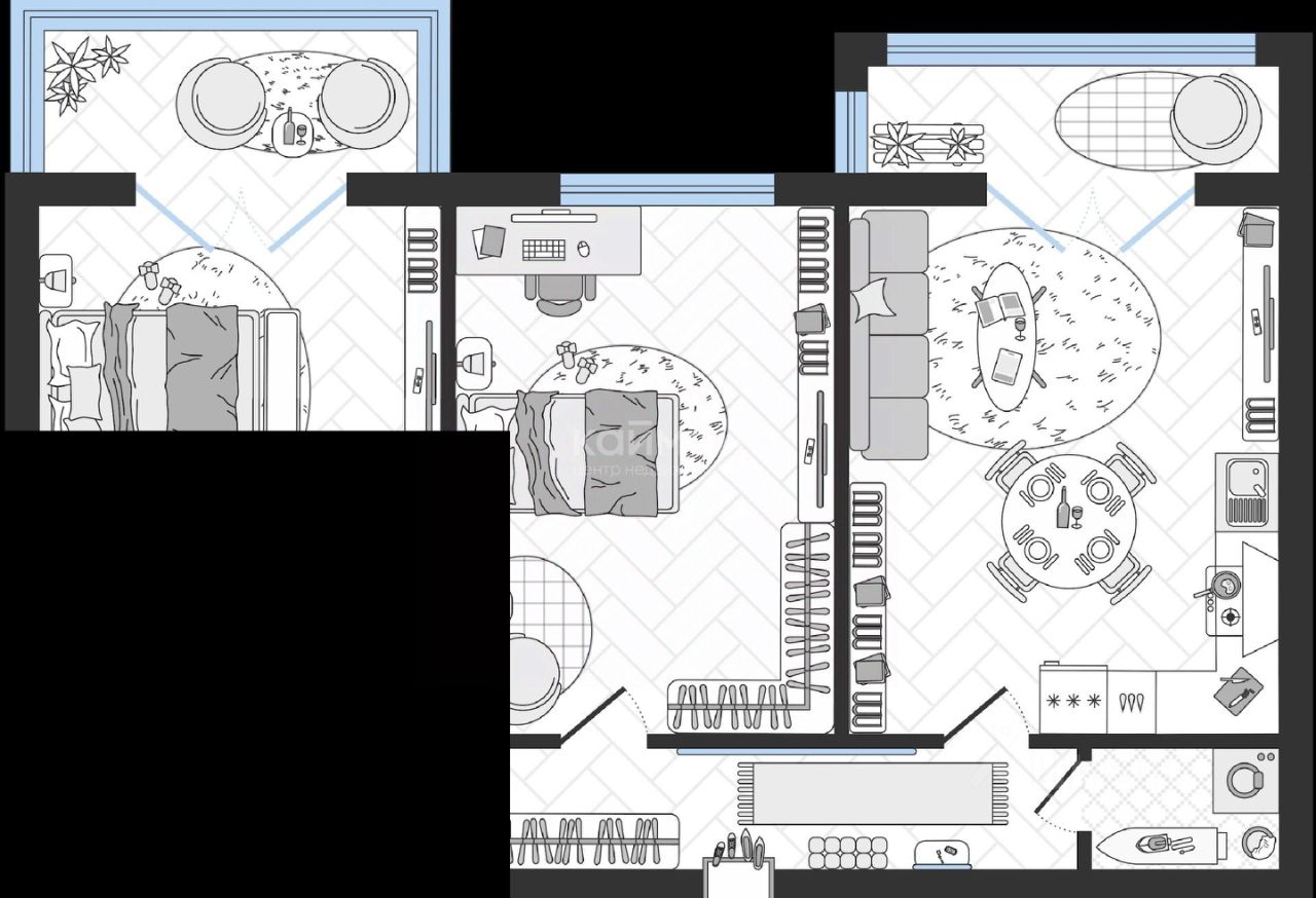 Квартира имеет правильную прямую планировку: просторная кухня-гостиная с выходом на лоджию для созерцания закатов, две вместительные комнаты, в одной из которых есть выход на балкон, два санузла.