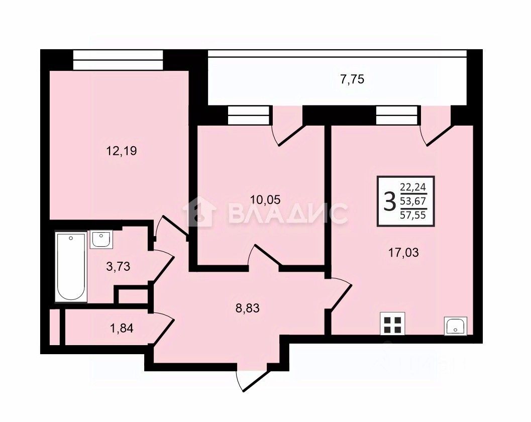 лоджия — 7,75 м² (выход из двух комнат)